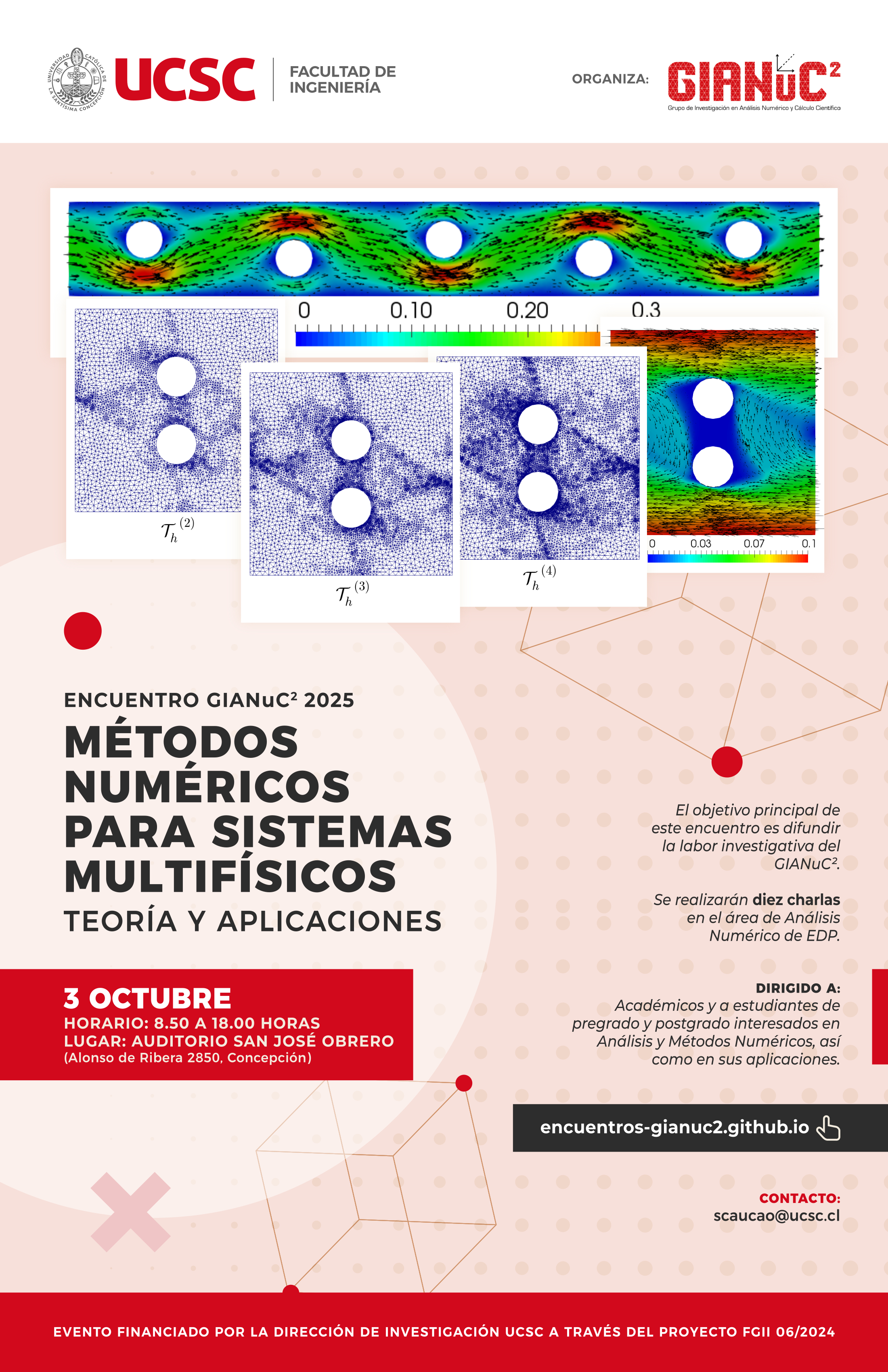 El Encuentro GIANuC² 2025: Métodos Numéricos para Sistemas Multifísicos - Teoría y Aplicaciones, es un evento organizado por el Grupo de Investigación en Análisis Numérico y Cálculo Científico (GIANuC²) de la Facultad de Ingeniería, Universidad Católica de la Santísima Concepción, Chile. Se llevará a cabo el Viernes 3 de Octubre de 2025 en el Auditorio San José Obrero de la UCSC. Tiene como objetivo principal difundir la labor investigativa del GIANuC² a la comunidad universitaria local y externa.